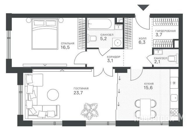 2-комнатные квартиры предложены в евроформате — с двумя спальнями и кухней-гостиной. В них предусмотрено в основном по два санузла, есть лоты с отдельной гардеробной, с мастер-спальней и постирочной. Планировки — линейные, угловые и «распашонки». 3-комнатные квартиры предлагаются в классическом и евроформате, с несколькими санузлами и мастер-спальнями. Планировки — линейные, угловые и «распашонки».