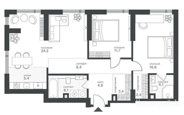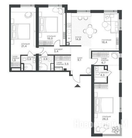 В 4-комнатных квартирах также есть несколько санузлов, гардеробные и мастер-спальни. Окна таких квартир выходят на две или три стороны света.