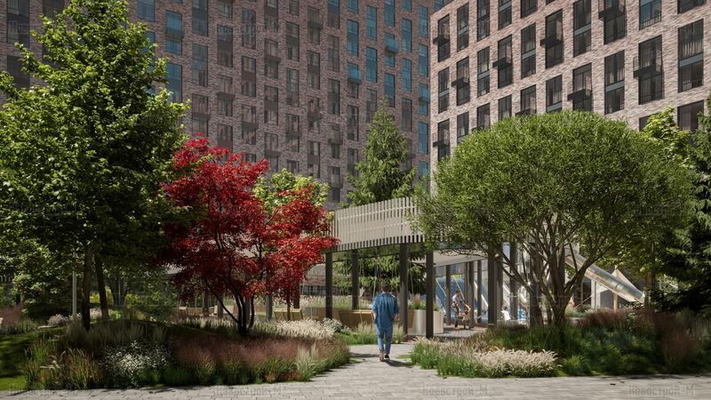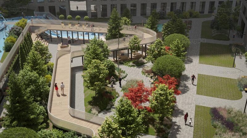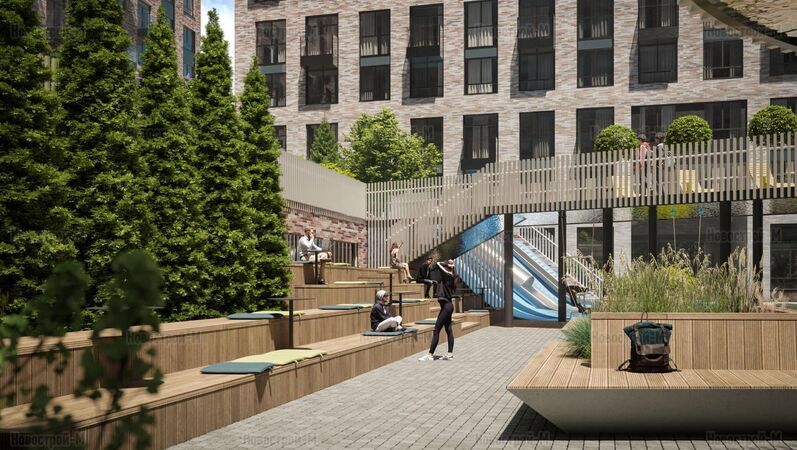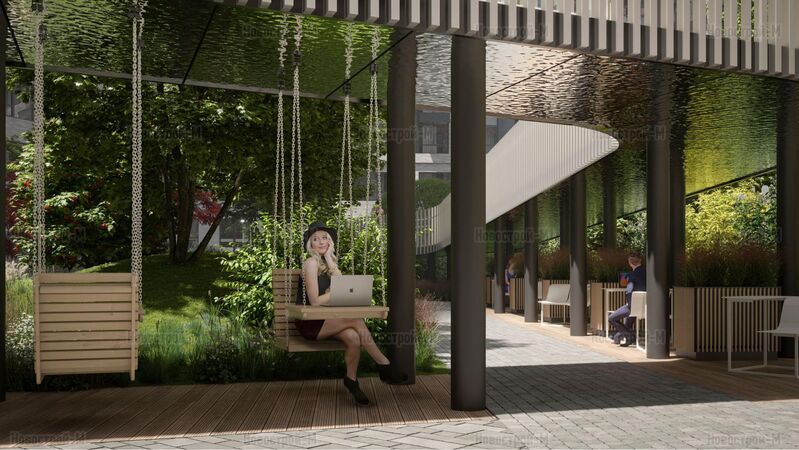 Естественные перепады рельефа до 3 метров обыграны в обустройстве двора — специалисты бюро Upland спроектировали его двухуровневым. На нижнем уровне площадью 0,44 га разместятся амфитеатр, лаундж-зоны с гамаками и лежаками, пешеходные дорожки. Продуман также open space на открытом воздухе с уличными рабочими кабинетами, кроме того, в ЖК будет коворкинг площадью около 500 кв. метров.