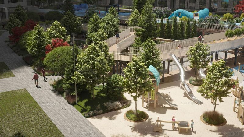 На верхнем уровне двора площадью 0,25 га появятся workout-зона и большой игровой комплекс на морскую тематику: с горкой-водопадом и пляжем-песочницей с корабликом. Ярусы двора будут соединены пешеходным мостом длиной 90 метров. Для любителей велосипедов и владельцев домашних животных предусмотрены велодорожки и площадка для выгула собак.