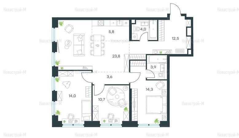 2-, 3- и 4-комнатные квартиры представлены в евроформате, в них появляются постирочные, гостевые санузлы, комнаты с двумя и более окнами, мастер-спальни, маленькие балкончики и террасы.