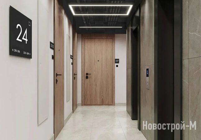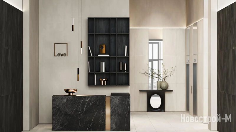 В отделке лобби используются природные цвета, которые перекликаются с оформлением фасадов, износостойкие керамогранит и штукатурка. Близость к природе дизайнеры подчеркнут с помощью живых растений. Концепцию интерьера дополнят элегантные светильники в минималистичном стиле.