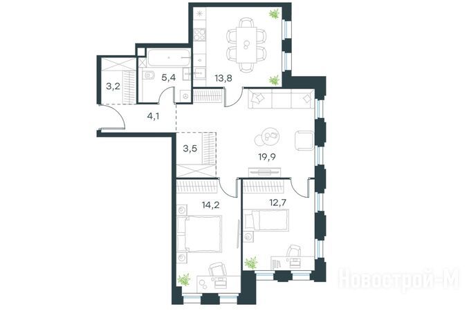 Площадь квартир по проекту начинается от 19 кв. м. — это студии (в феврале 2026 года их нет в продаже, как и самых просторных 82-метровых «трешек»). Однокомнатные квартиры с изолированной спальней имеют метраж 29,5–69,1 кв. м, в большинстве из них по 3-4 окна. «Евродвушки» — от 51,4 кв. м с возможностью зонирования, кладовыми и гардеробными. Трехкомнатные евроквартиры с двумя изолированными спальнями имеют площадь от 60,4 кв. м. Планировки таких квартир линейные или угловые (в угловых по 4 окна).