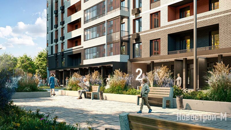 Территория благоустроена по концепции «умный двор без машин», здесь появятся пешеходные бульвары со скамейками и освещением, детские и спортивные площадки, места для отдыха. Для автомобилей предусмотрены плоскостные парковки.
