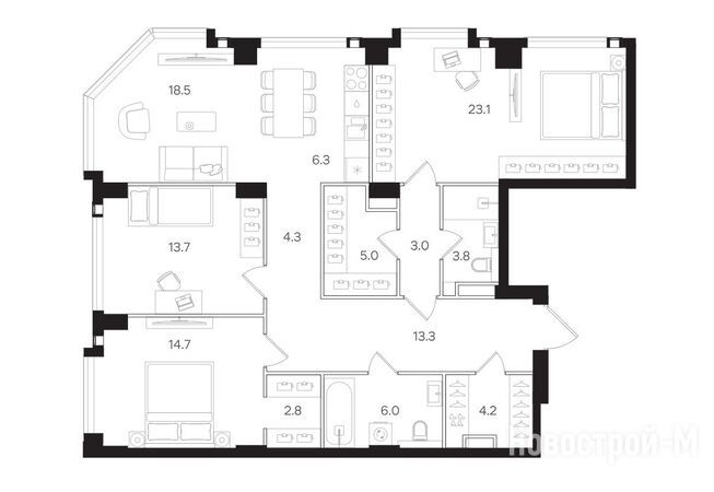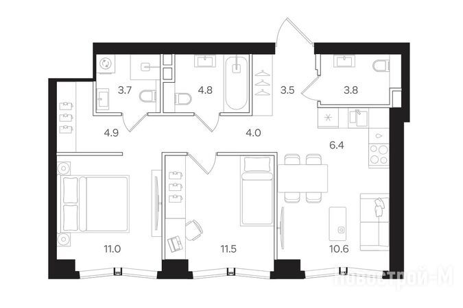 3-комнатные комнаты представлены одним вариантом планировки площадью 85,5 кв. м. Здесь три санузла (один из них в мастер-спальне) и ниши для хранения.