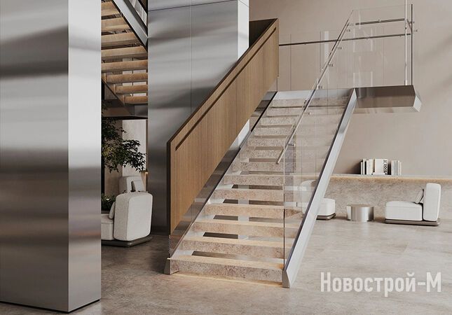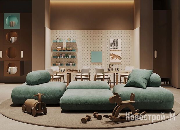 В гранд-лобби запроектирована велком-зона, откуда можно попасть в кофейню и пекарню. На антресольном этаже лобби разместятся конференц-зал, коворкинг, кофе-поинт с зоной отдыха. В каждой секции — колясочные и лапомойки.