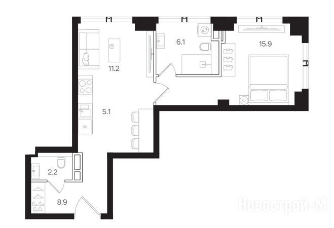 Площадь 1-комнатных квартир — от 39,5 до 42,9 кв. м. В таких квартирах есть ниши для хранения, в некоторых планировках имеются мастер-спальни.