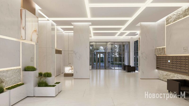 Попадать в дом жители комплекса будут через просторные дизайнерские лобби. В центральном лобби появится круглосуточная зона ресепшн, уютное лаунж-пространство с мягкой мебелью и журнальными столиками. В отделке пространства будут использованы природные материалы с различными фактурами: необработанный камень, гладкий мрамор и металл.