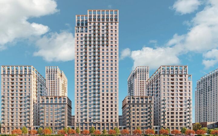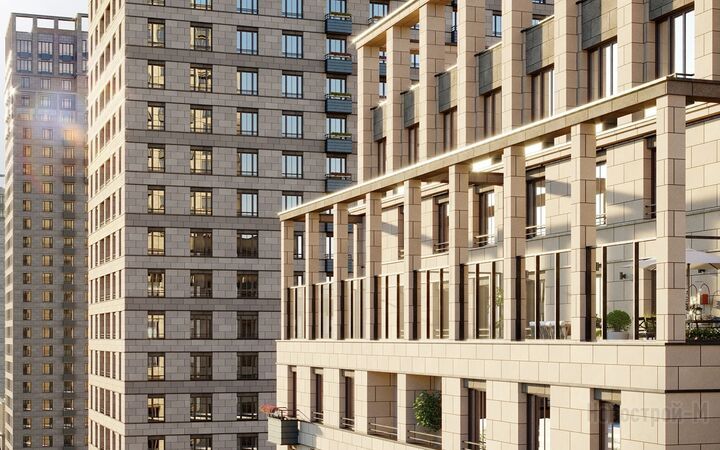 Высокие и среднеэтажные секции чередуются, крупная подрезка в верхней части домов образует запоминающийся силуэт кварталов. Для отделки фасадов использован керамогранит светлого оттенка с фактурой камня. Тёмные тона в нижней части зданий подчеркивают их основательность. На крышах высотных секций, высота которых достигает 50 метров, будут размещены террасы.