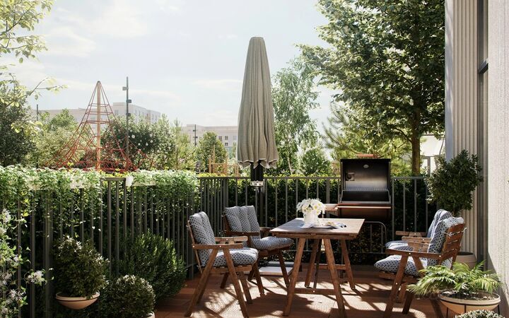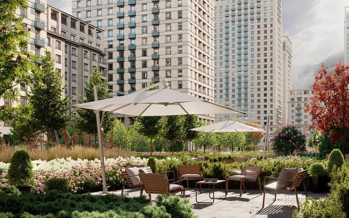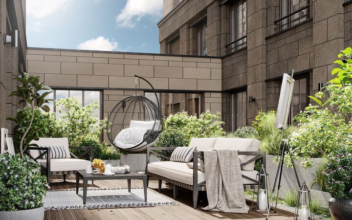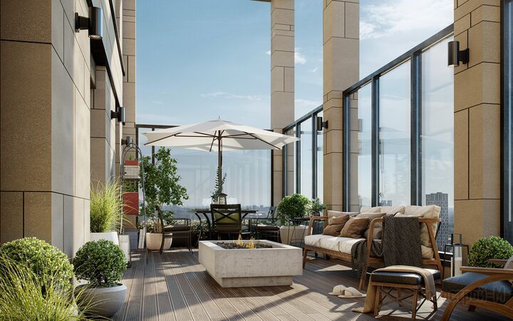 Особого внимания заслуживают двухуровневые квартиры с открытыми террасами. Спланировать такое помещение можно с учетом образа жизни: сделать на первом уровне спальни, а на втором — место для творчества и веселья или, наоборот, разместить на первом уровне свой домашний офис, а второй — сделать приватным пространством для отдыха. Площадь террас достигает 40 кв. м, здесь легко уместятся не только шезлонги, но и детский надувной бассейн, настольный теннис или мини-гольф.