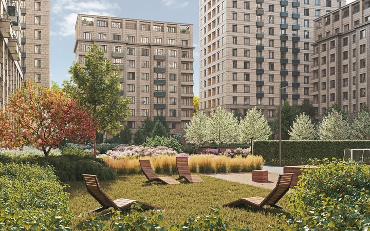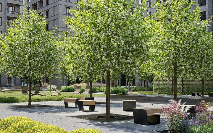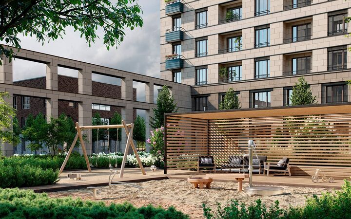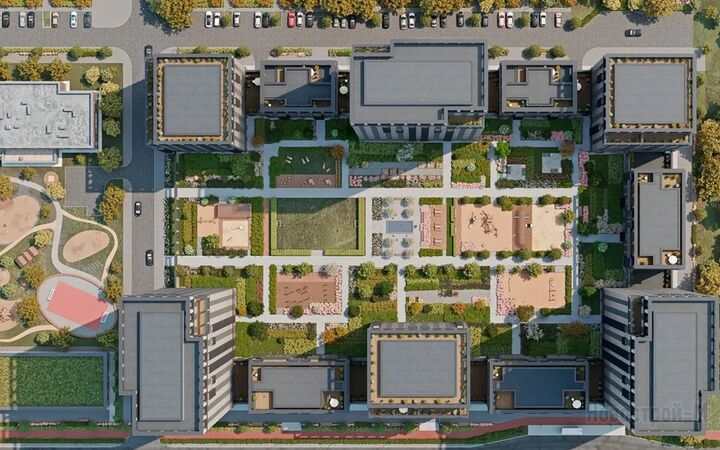 Секции, расположенные в форме квадратов, образуют внутренние дворы. Эти территории закрыты для машин и разделены на функциональные зоны. Во дворе появятся центральная площадь с водным объектом, несколько детских площадок с деревянным игровым оборудованием для разных возрастных групп, спортивные площадки, лужайка для командных игр, места для пикников и укромные уголки для тихого отдыха.