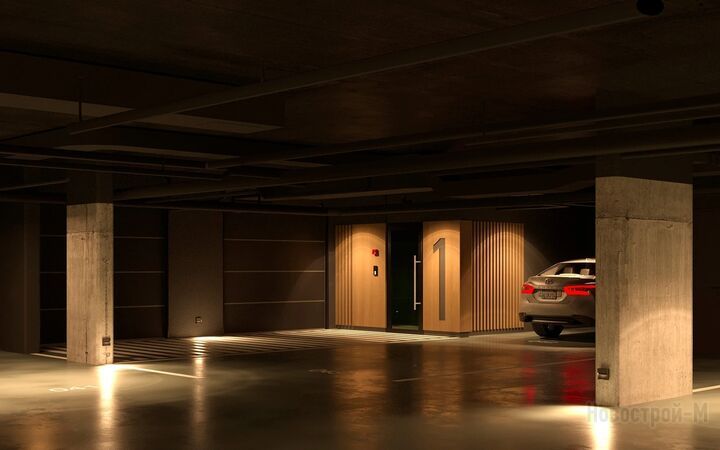 На подземном этаже будет оборудован паркинг на 326 автомобилей. Согласно проекту, потолок и стены здесь окрашены в темный цвет, на входе установлены деревянные панели. Есть мягкая подсветка и понятная навигация, благодаря которым можно быстро найти свое парковочное место.