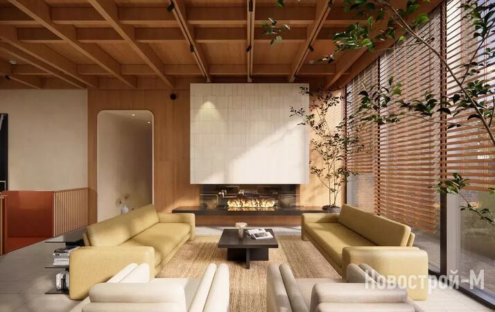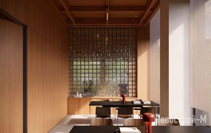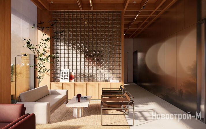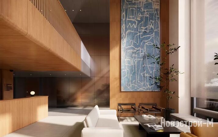 Дизайн двухуровневого лобби для ЖК «МИRА» разработало бюро Gaag Studio. Отделка будет выполнена в теплых оттенках корицы и охры. Лобби второго корпуса займет два этажа. На первом будет гардеробная, кухня и закрытая зона переговорной. На втором – лаундж-зона с библиотекой.