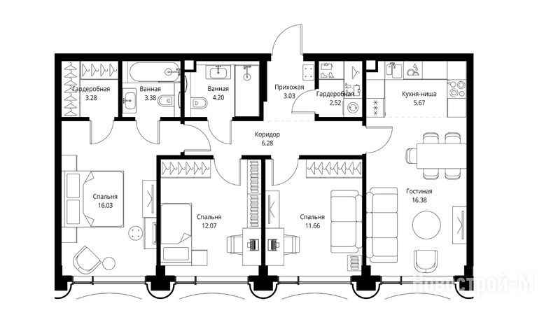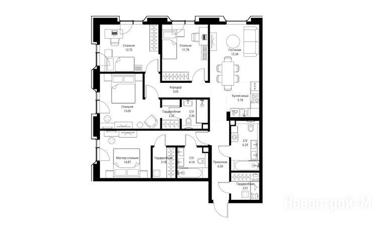 Самый дорогой вариант в имеющемся предложении – квартира площадью 107,33 кв. м с тремя спальнями, мастер-спальней (с гардеробной и своим санузлом), еще двумя санузлами и двумя гардеробными и просторной гостиной с кухней-нишей. Стоит она 63,3 млн рублей.