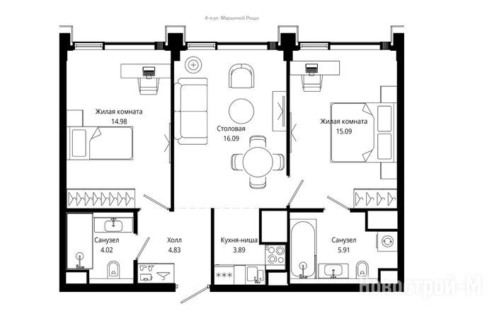 Площадь 2-комнатных — от 61,78 до 105,49 кв. м, в таких квартирах также есть мастер-спальни, по два санузла, ниши в холлах, в некоторых планировках — большие гардеробные и эркеры.