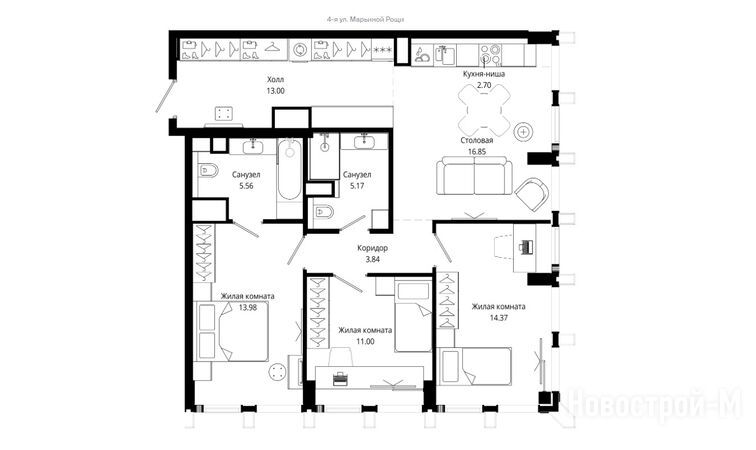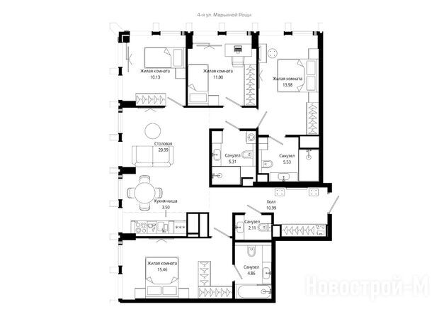Квартир с тремя комнатами в продаже представлено немного, в них имеются мастер-спальни, столовые и ниши в холлах. Четырехкомнатные варианты — площадью от 106 кв. м, с четырьмя раздельными санузлами, двумя мастер-спальнями, кухней-нишей и столовой.