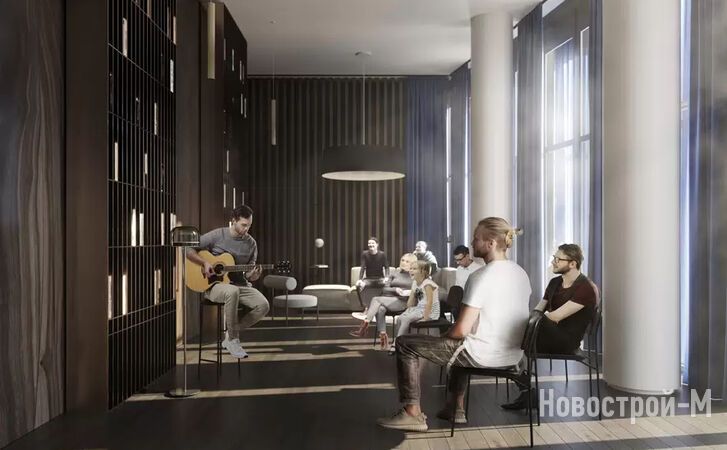 Стойки ресепшн из натурального камня и зонирование лобби также спроектированы бюро Kleinewelt Architekten. Выходы во двор и на улицы расположатся на уровне земли. В лобби разместятся настенные фонтаны-водопады, гостевые зоны с мягкой мебелью, читальные зоны с кофе-поинтами, колясочные, лапомойки, гостевые санузлы, розетки для зарядки гаджетов.