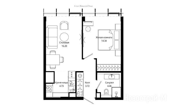 Площадь 1-комнатных квартир в продаже — от 39,6 до 63,94 кв. м. Особенности планировок: в квартирах с большей площадью имеются мастер-спальни и ниши под гардероб в холлах. Есть варианты с четырьмя окнами и эркерами.