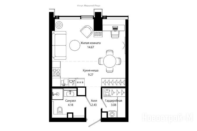 Площади студий на витрине — от 29,4 до 34,18 кв. м с двумя или тремя окнами, кухней-нишей, гардеробной, с большим санузлом.