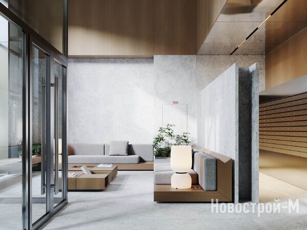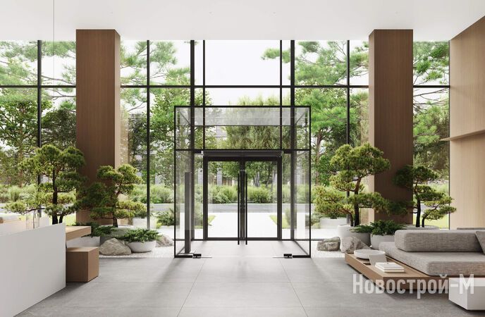 Минималистичный дизайн лобби разработала компания Babayants Architects. Входные группы будут отличаться наличием большого количества света и воздуха благодаря высоким потолкам и увеличенной площади остекления. В отделке МОП применят материалы природных оттенков и фактур (в том числе натуральное дерево) с преобладанием светло-серого, бежевого, песочного цветов. В оформлении лобби также будут использоваться живые растения. Пространство будет функциональным и сочетать в себе места для отдыха, встречи гостей и работы с ноутбуком. Также для удобства резидентов здесь будут оборудованы мойки для мытья лап собак и колясочные.