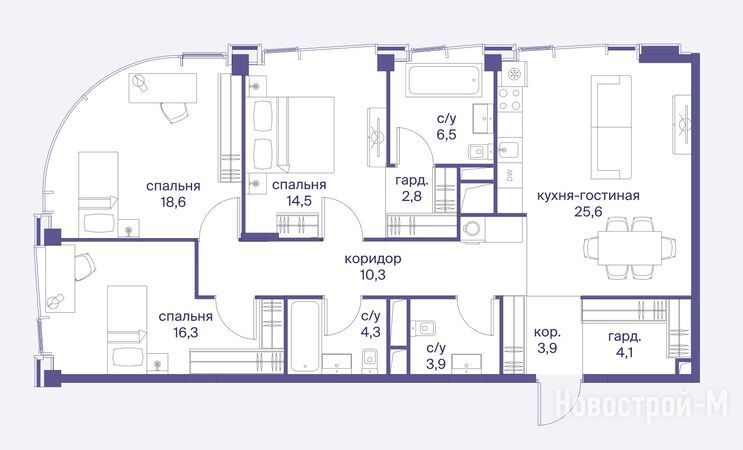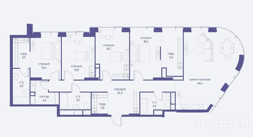 В первой половине февраля 2026 года есть квартиры от студий площадью от 35,9 кв. м до 243-метровых 4-комнатных. Есть варианты с гардеробными, мастер-спальнями, несколькими санузлами, постирочными, кабинетами. Часть квартир имеет неправильную форму — с полукруглыми окнами.