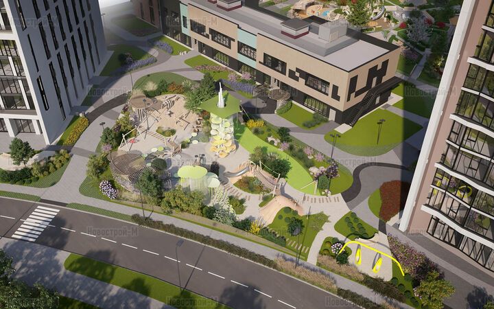 Центральная зона двора «Мир птиц» по форме напоминает гнездо, во дворе появится детская площадка с игровыми элементами в форме яиц и «скворечник» для малышей. Игровые комплексы двора «Затерянный город» похожи на крепостные развалины, в «Джунглях» будут различные «лазалки», а в «Холмах» — домики хоббитов. Озеленение и места для отдыха тоже будут выполнены в соответствующей тематике.
