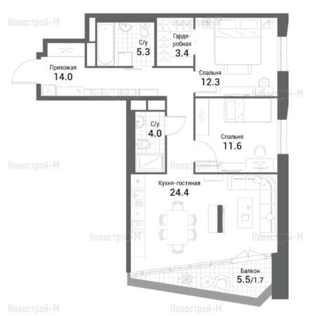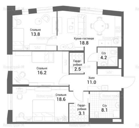 Во всех квартирах имеются помещения под гардеробные, начиная с 2-комнатных вариантов — увеличенное число санузлов и мастер-спальни. Для больших квартир проектировщики предлагают такие варианты использования комнат как, например, кабинет или тренажерный зал.