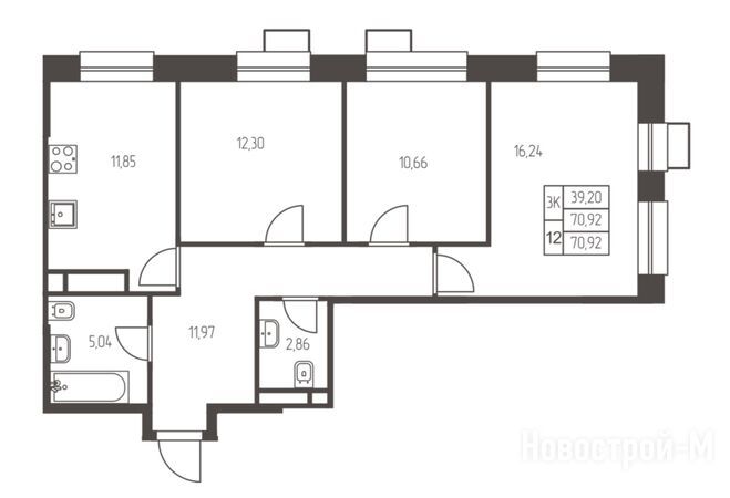 Планировочные решения разнообразные. Есть студии вытянутой и квадратной формы, с одним или двумя окнами. Среди однокомнатных есть варианты с раздельным и совмещенным санузлом, в некоторых квартирах в коридоре остается ниша для организации кладовой или небольшой гардеробной. В многокомнатных квартирах расположение комнат в основном линейное, но есть несколько лотов с проходной кухней, по обе стороны от которой расположены спальни.