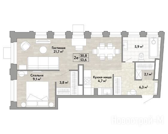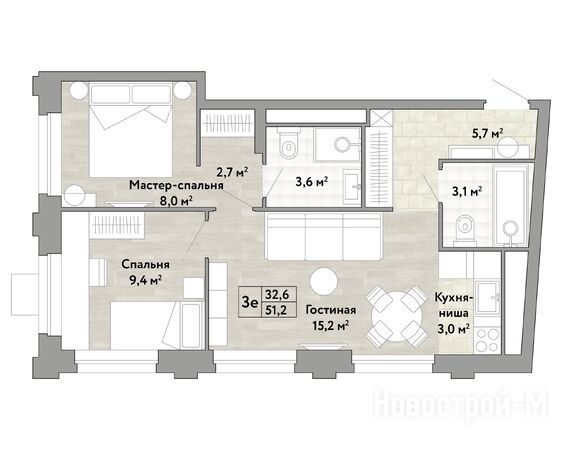 2-комнатные квартиры представлены в классическом и евроформате. В них есть ниши в прихожих, гардеробные, мастер-спальни с санузлом и гардеробной. В некоторых вариантах предусмотрено окно в ванной. Планировки — также линейные и угловые.