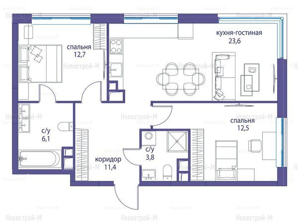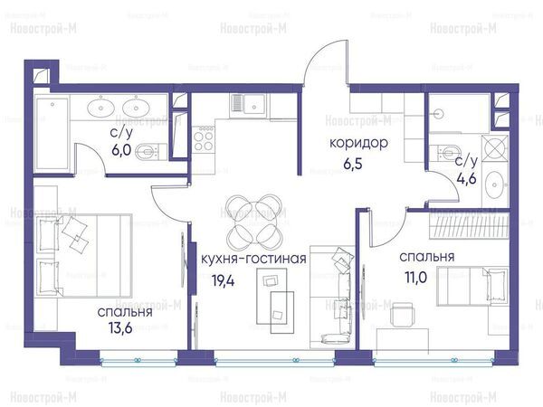 В 2-комнатных квартирах появляются несколько санузлов и мастер-спальни, а также постирочные. В некоторых лотах с тремя и более комнатами одна из комнат обозначена как «кабинет», есть террасы и хозяйственные помещения. Есть варианты планировок с окном в ванной, с панорамным остеклением, просторной кухней-гостиной.