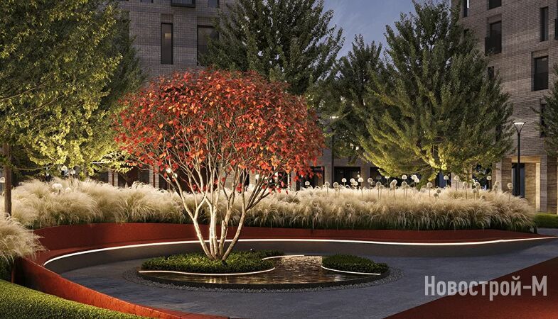 Разработкой концепции благоустройства занималось бюро Magly. Во дворе будет две точки притяжения: арт-объект и водная гладь, у которой разместится зона отдыха. Также во внутреннем пространстве будут: площадки для занятия воркаут и йогой, зоны комьюнити, уличные коворкинги и две детские площадки, специально для которых было разработано игровое оборудование на развитие воображения и ловкости.