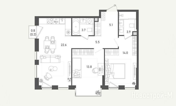 Самый дорогой вариант в доступном предложении – квартира площадью 92,7 кв. м. В ее планировке три спальни, три санузла и большая кухня-гостиная площадью 50,8 кв. м с панорамным джамбо-окном. Продается этот лот за 36,9 млн рублей.