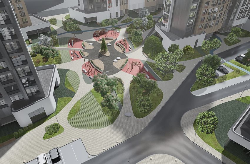 Дворовая территория будет приватной, без доступа автомобилей. Запланирован дизайнерский разноуровневый ландшафт дворов, деревья и кустарники посадят по принципу всесезонности. Застройщик оборудует беговые дорожки с зонами для тренировок, площадки для йоги на свежем воздухе, игровые площадки для детей с европейским оборудованием, универсальные спортплощадки, велосипедные дорожки и гостевые парковки. В центре квартала будет общественная площадь.