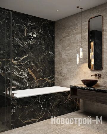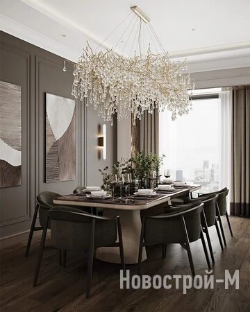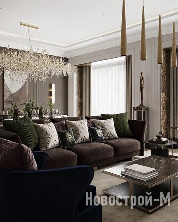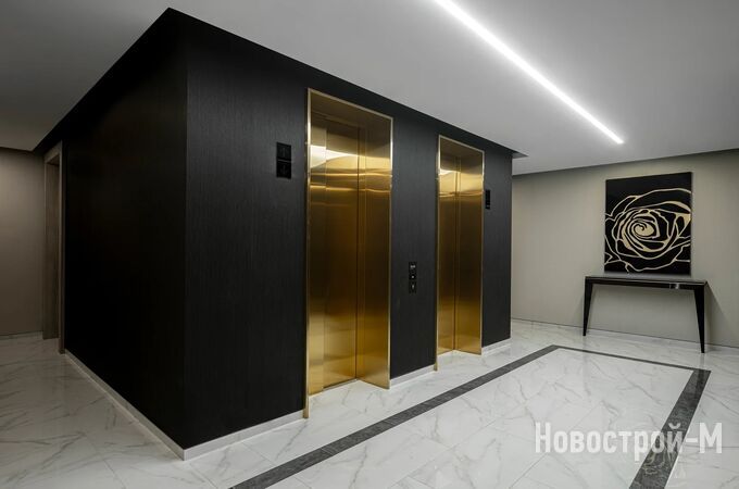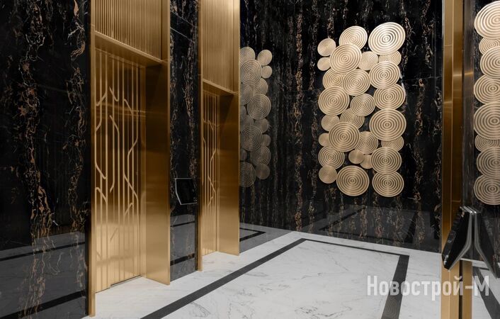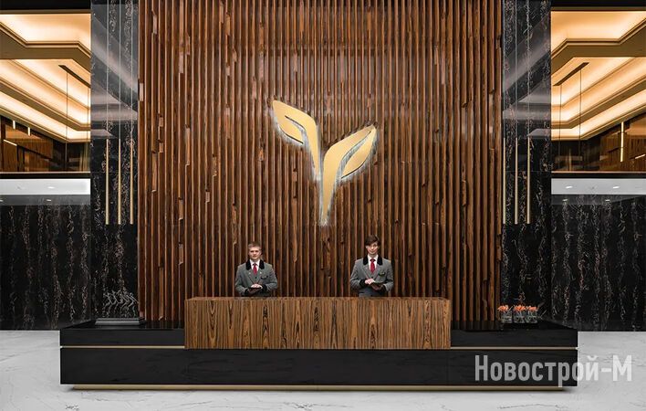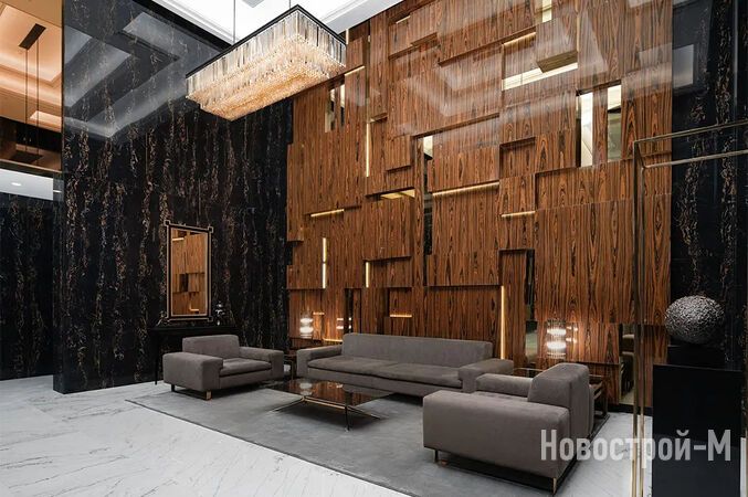 Холл в лобби будет украшен массивной дизайнерской люстрой, изготовленной по специальному заказу. Входные группы отделаны бразильским кварцевым гранитом и ламелями из ценной породы черного дерева макассар.