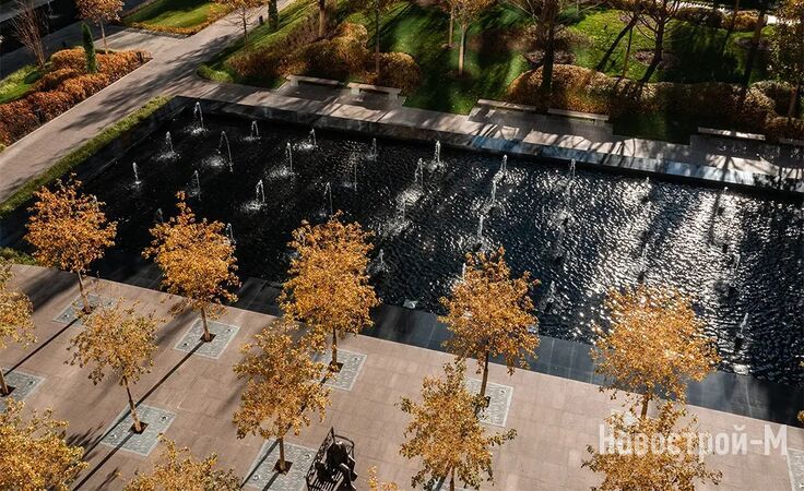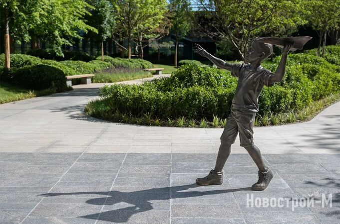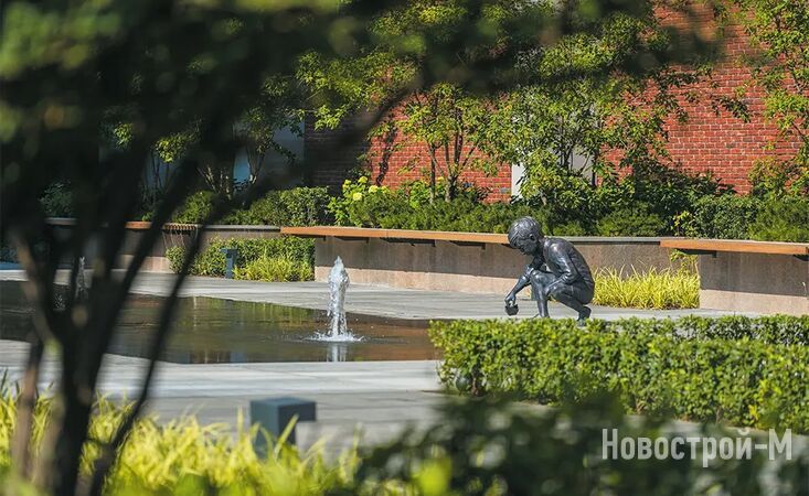 Предусмотрены детские и спортивные площадки, места для отдыха, прогулочные дорожки, дизайнерские клумбы и цветники, разноуровневое освещение, арт-объекты.