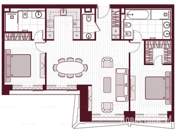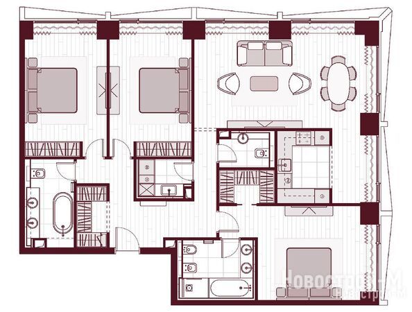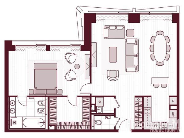 В квартирах есть гардеробные, кладовые, дополнительный санузел встречается уже в «двушках». В гостиных предусмотрена возможность полностью отделить зону кухни. В многокомнатных планировках имеются мастер-спальни с отдельными санузлом и гардеробной.