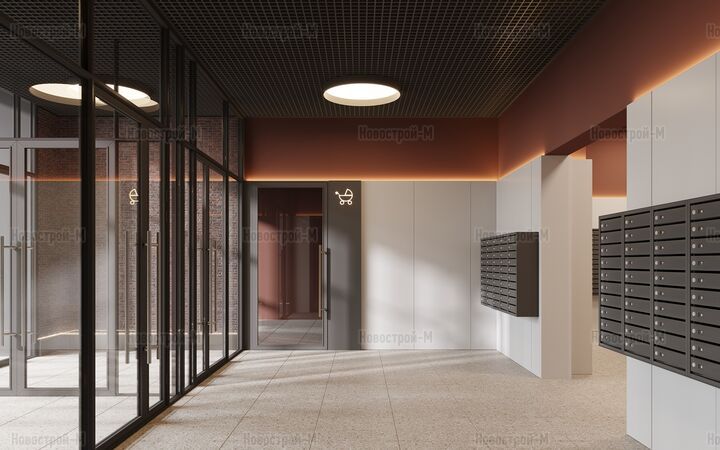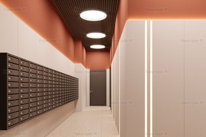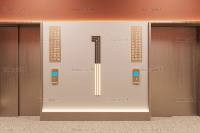 Идеи урбанизма и современного минимализма продолжаются в дизайне входных групп. Для отделки использованы гипсовые 3D-панели с подсветкой. Контрастные цвета и строгие линии смотрятся элегантно и современно. Таблички с номерами квартир будут выполнены в индивидуальном дизайне.