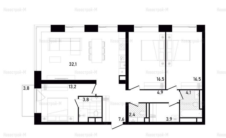 «Евротрешки» представлены угловыми и линейными планировками. В них также есть мастер-спальни, помещения под кладовую или гардеробную, балконы.