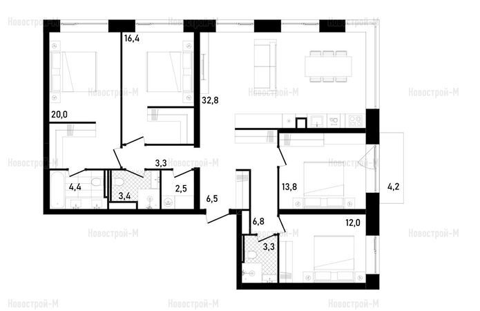 Квартиры с четырьмя спальнями и кухней-гостиной — угловые. В них также есть мастер-спальни, кладовые и балконы.