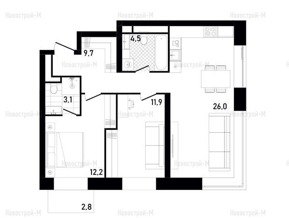 Квартиры-студии — классической формы, с одним окном. В «евродвушках» имеются кладовые, балконы, лоджии, есть варианты с тремя окнами, мастер-спальнями.