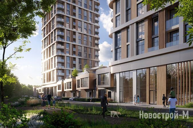 Фасады будут теплых натуральных цветов, в высотных корпусах появятся озелененные скай-террасы, а в таунхаусах будут благоустроены эксплуатируемые крыши.
