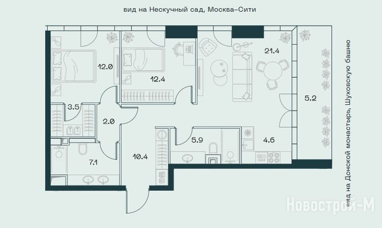 Из окон открываются эффектные виды на Нескучный сад, «Москву-Сити», стадион «Локомотив», парк Горького и МГУ, на Шуховскую башню и Донской монастырь.