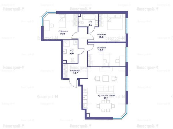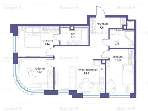 3-комнатные квартиры также представлены в евроформате. Их отличия: одна или две мастер-спальни, гардеробные, угловые закругленные окна, в некоторых планировках, помимо двух спален и кухни-гостиной, предусмотрен кабинет.