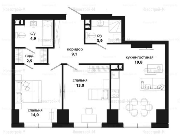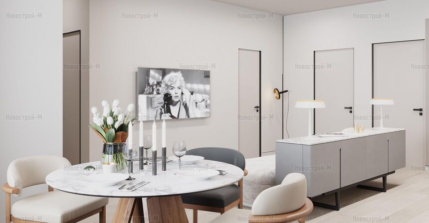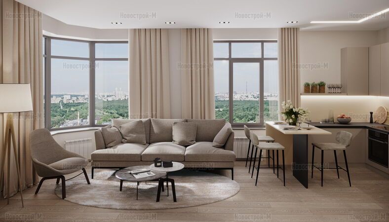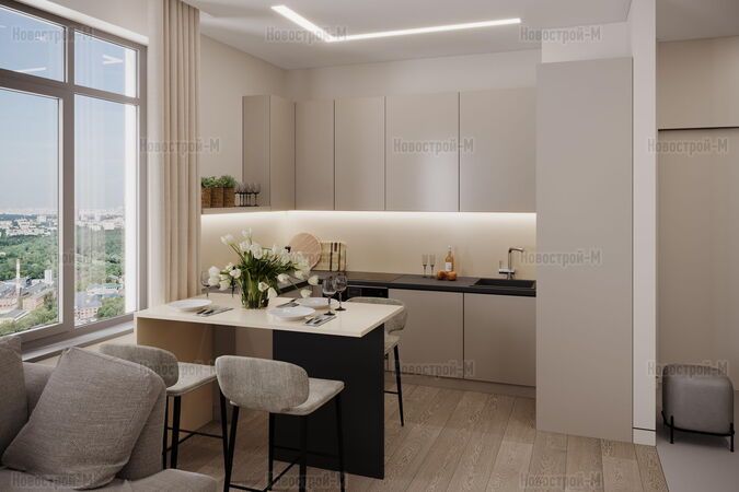 В квартирах с двумя комнатами и кухней-гостиной имеются мастер-спальни с санузлом и гардеробной, есть отдельные гардеробные. Планировки — линейные и угловые. Площадь таких квартир — от 60,6 до 98,4 кв. м.
