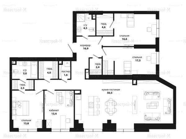 В квартирах с большим количеством комнат запроектировано по несколько санузлов и гардеробных, а площадь кухни-гостиной превышает 30 кв. м. В ряде планировок имеются постирочные и кабинеты.