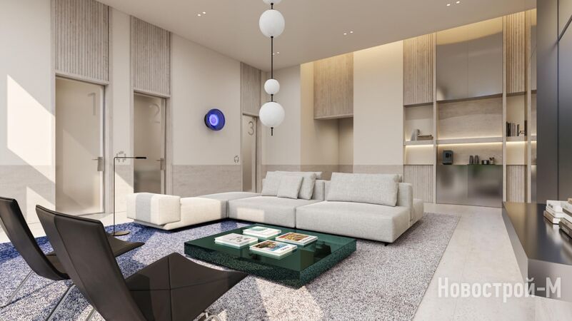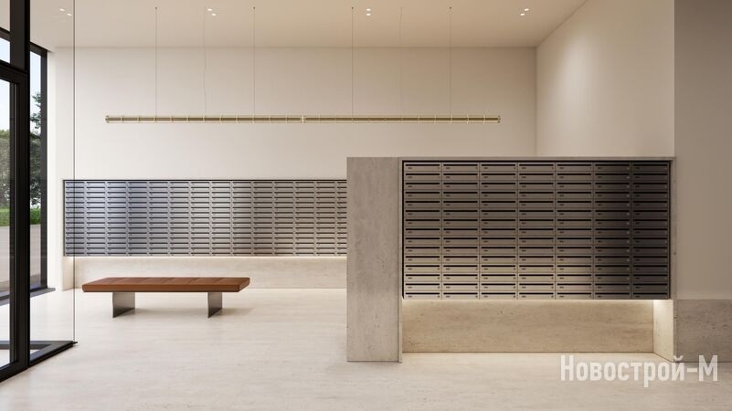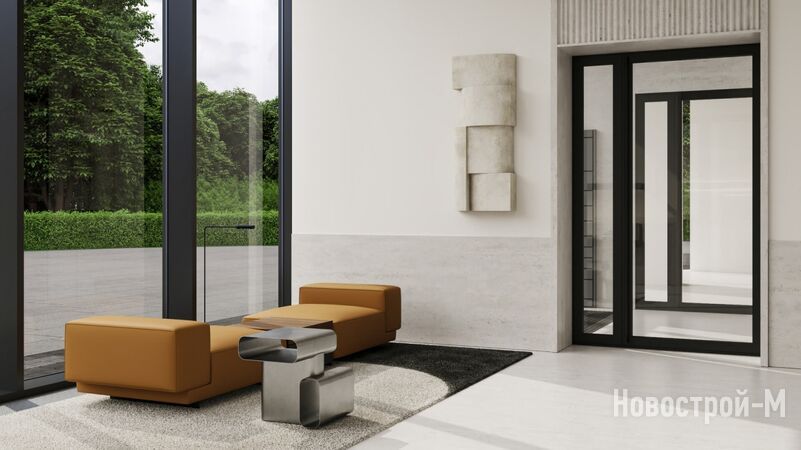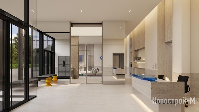 Проект лобби создала команда RYMAR.studio. Минималистичный интерьер с выразительными акцентами должен подчеркнуть воздушность и открытость пространства.