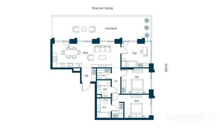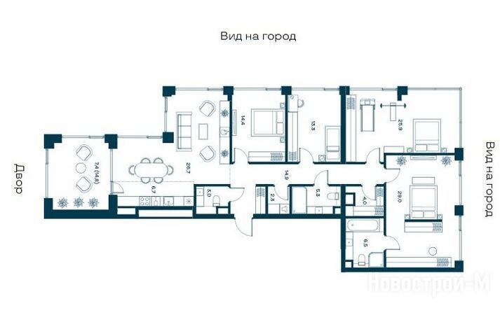 Четырехкомнатные варианты в реализации имеют площади от 118,9 до 159,4 кв. м. Они есть как в башнях, так и в камерном доме Unique.