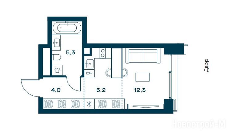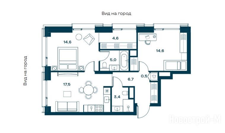 Однокомнатные квартиры представлены в евроформате — с просторной кухней-гостиной, трехметровыми потолками и панорамным остеклением. Есть варианты с французским балконом, одной или двумя гардеробными. Площадь «однушек» на витрине составляет 41,2 – 53,5 кв. м.