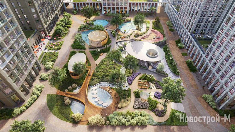 В закрытом внутреннем дворе будет создан многоуровневый ландшафтный парк со сложным рельефом, несколькими водоемами и ручейками, обилием зелени и цветущих растений.