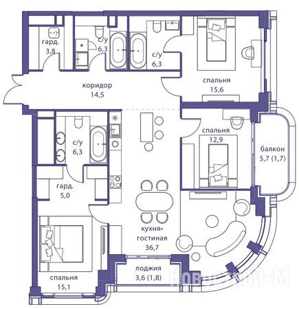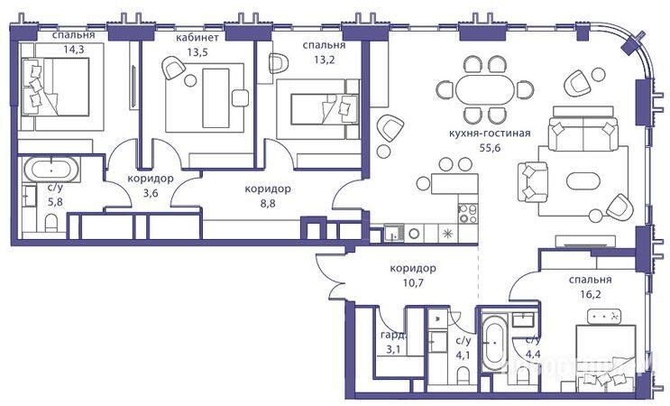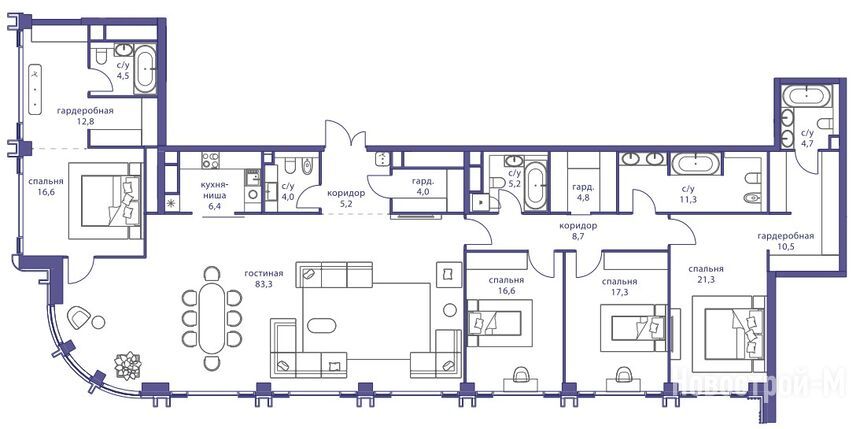 Самый дорогой вариант сейчас стоит 470,6 млн рублей. Это квартира с четырьмя спальнями, кухней-нишей (6,4 кв. м), огромной гостиной (83,3 кв. м), пятью санузлами и четырьмя гардеробными. Ее площадь составляет 241,7 кв. м. Располагается она на 18 этаже второго корпуса.